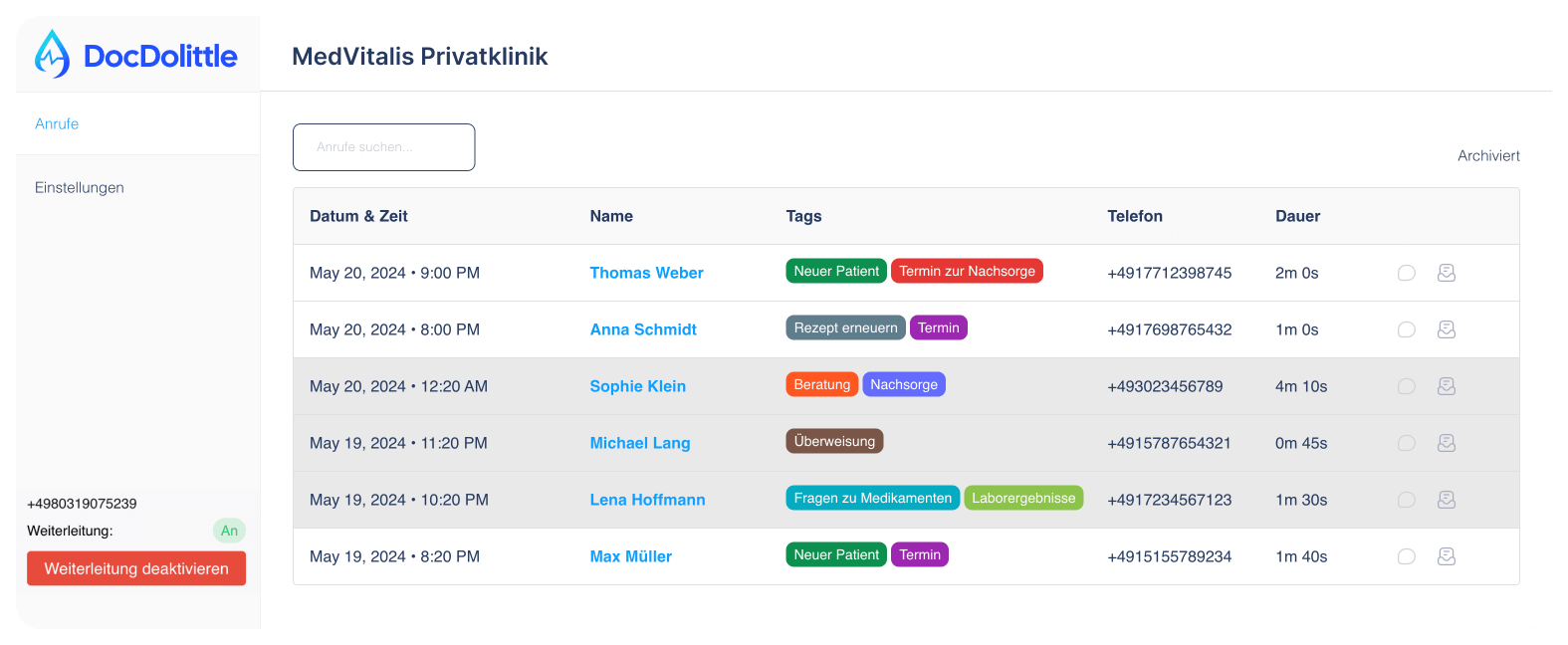 DocDolittle ist Ihr digitaler Telefonassistent. Er nimmt alle eingehenden Anrufe entgegen – von Patienten, Apotheken, Ärzten oder anderen Kontakten – und fasst sie DSGVO-konform für Sie zusammen.Individuell sortierte Anfragen