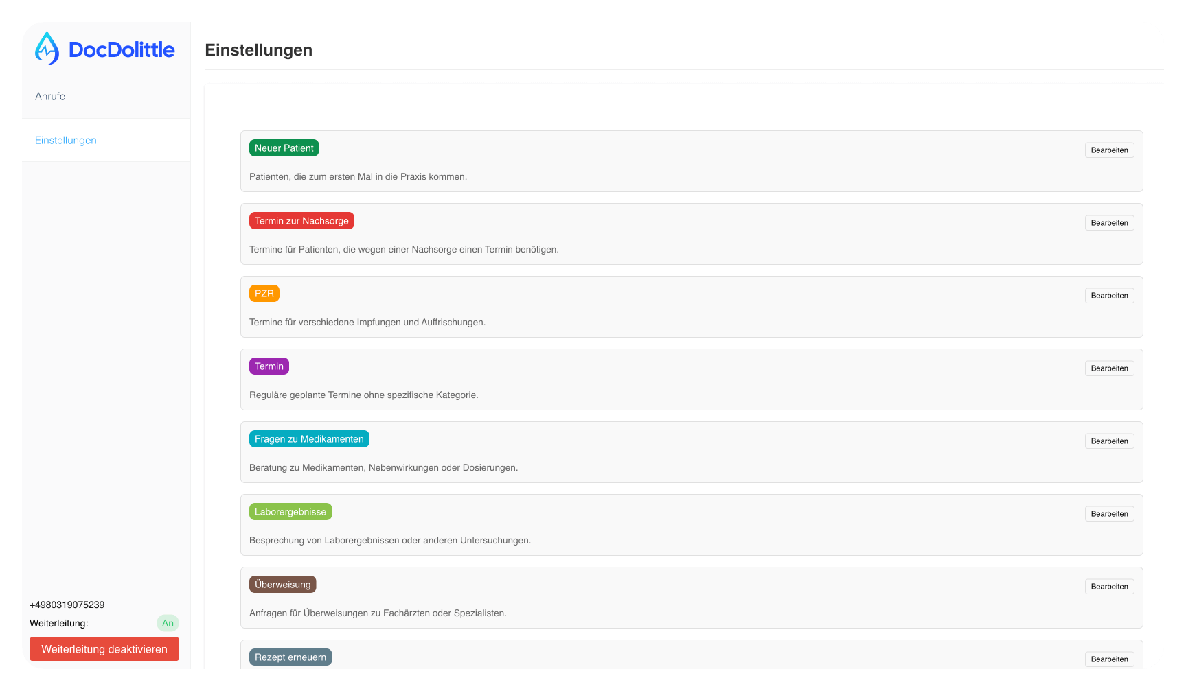 Sie können entweder Ihre Praxisnummer umleiten oder eine separate Nummer verwenden, um DocDolittle zu testen.